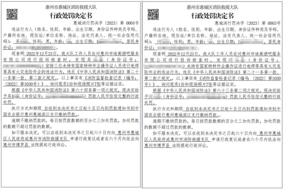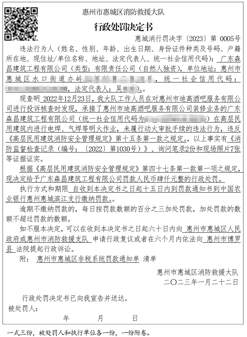 2022 年12 月23 日,惠州市惠城區(qū)消防救援大隊工作人員在對惠州市迪高酒吧服務有限公司進行投訴核查時發(fā)現(xiàn),承接其裝修業(yè)務的廣東森昌建筑工程有限公司在高層民用建筑內(nèi)進行電焊、氣焊等明火作業(yè),未履行動火審批手續(xù)、進行公告的違法行為,違反《高層民用建筑消防安全管理規(guī)定》第十五條第一款之規(guī)定。發(fā)現(xiàn)吳某某安排未持有國家特種作業(yè)操作證的閆某某、陶某某、葉某某進行電焊等具有火災危險作業(yè)的違法行為,違反《中華人民共和國消防法》第二十一條第一款、第二款之規(guī)定。