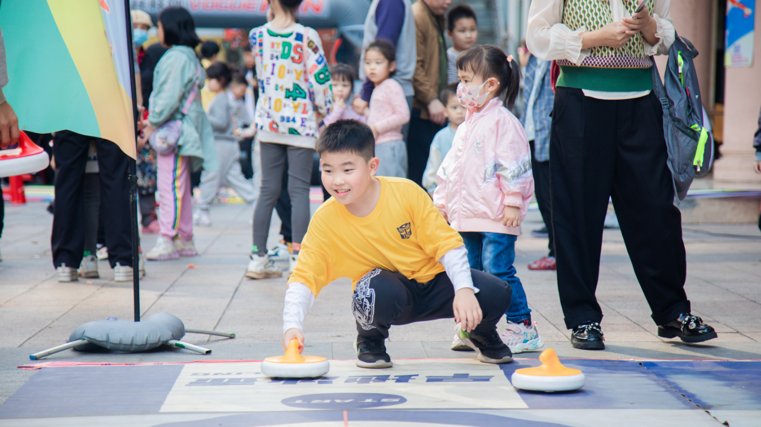 騎單車、走繩索、推冰壺、躍障礙……在美地花園城小區(qū),“少年勇士”“旱地冰壺”“扁帶英雄”“勇闖天涯”等13個趣味運動項目在小區(qū)空地上舉行,不少小區(qū)居民帶上小孩前來參與。根據比賽規(guī)則,完成10個項目后可以獲得相關獎勵。