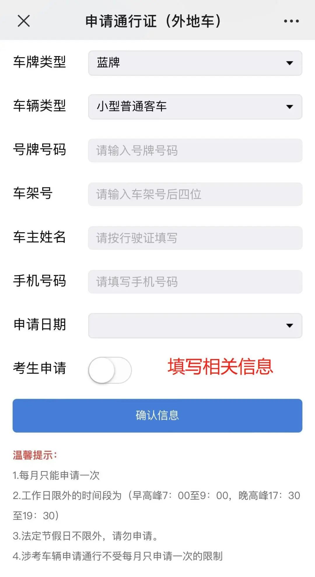 外地車一個(gè)月可以申請一次免限行,即可在限行時(shí)間內(nèi)在全市道路行駛,有需要的車主可通過深圳交警微信公眾號(hào)申請!