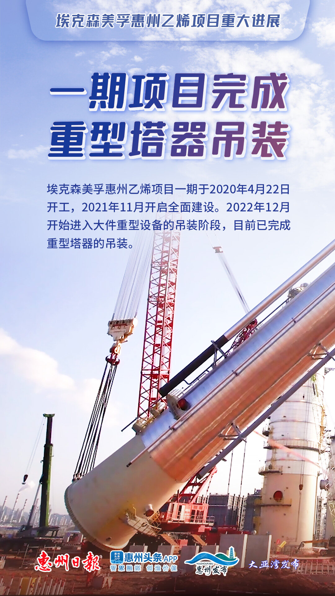 埃克森美孚惠州乙烯項(xiàng)目完成重型塔器吊裝