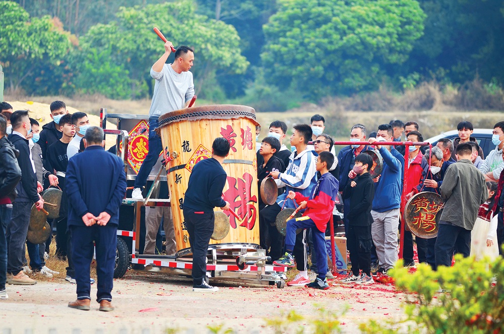 “震鼓獵龍一般選在正月新年的某一天,由村里的男丁將大鼓和銅鑼運(yùn)到野外的小山丘,等到約好的時(shí)辰開(kāi)始敲鑼打鼓,同時(shí)一路燃放鞭炮往回趕。”龍華大鼓的非遺傳承人李滿池介紹,“獵”在客家話中有“趕”的意思,“獵龍”就是到山上將龍當(dāng)作牛馬羊趕回去,鑼鼓聲起著驅(qū)趕作用。一般一個(gè)宗族如果一年來(lái)沒(méi)有添男丁,就會(huì)組織獵龍活動(dòng)。