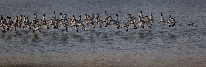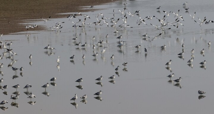 成群的長(zhǎng)腳反嘴鷸飛過水面蔚為壯觀。