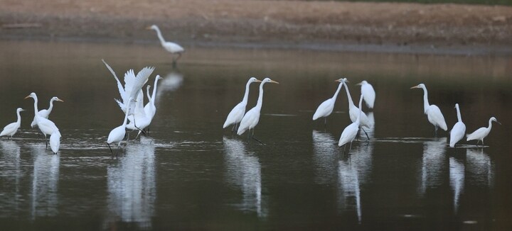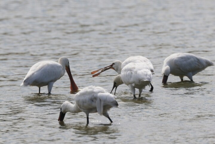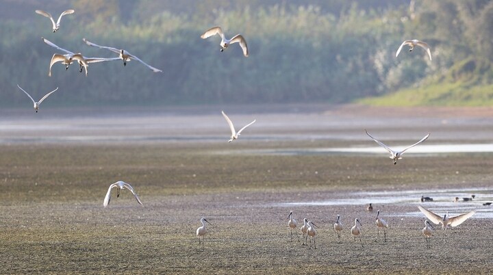 40只左右的黑臉琵鷺成一字隊(duì)形排開,200多只的長(zhǎng)腳反嘴鷸結(jié)隊(duì)向前推進(jìn),20多只琵嘴鴨,大中小白鷺、灰鷺穿插群中,在西枝江三棟鎮(zhèn)的水塘里共享饕餮盛宴。
