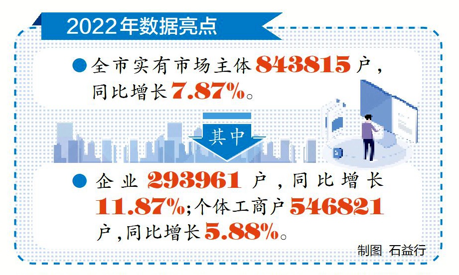 據(jù)統(tǒng)計,2022年,全市實有市場主體843815戶,同比增長7.87%。其中:企業(yè)293961戶,同比增長11.87%;個體工商戶546821戶,同比增長5.88%。2022年,全市新登記各類市場主體135248戶,其中新登記企業(yè)63105戶,個體工商戶71895戶。