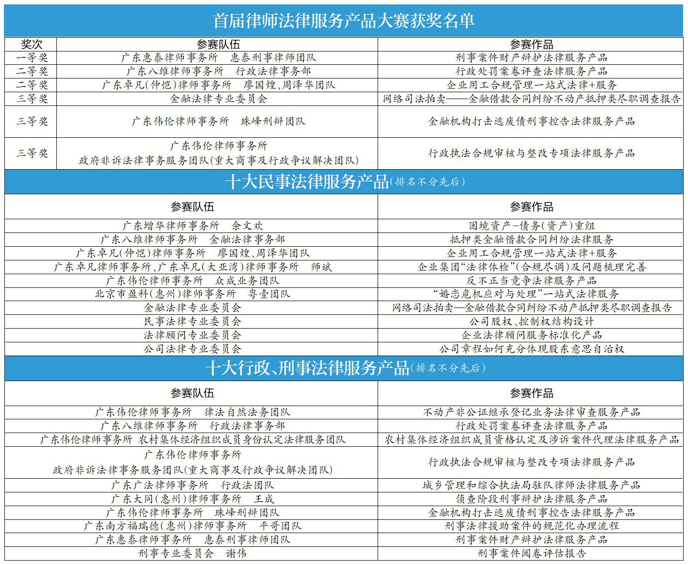 一等獎1名、二等獎2名、三等獎3名,同時(shí)公布“十大民事法律服務(wù)產(chǎn)品”“十大行政、刑事法律服務(wù)產(chǎn)品”獲獎名單