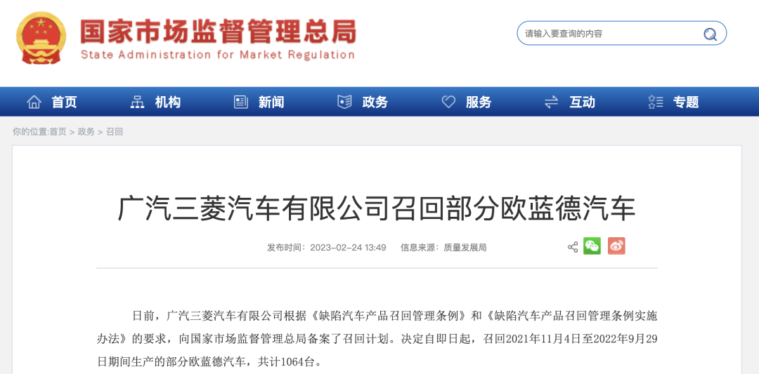 日前,廣汽三菱汽車有限公司根據(jù)《缺陷汽車產(chǎn)品召回管理條例》和《缺陷汽車產(chǎn)品召回管理條例實施辦法》的要求,向國家市場監(jiān)督管理總局備案了召回計劃。決定自即日起,召回2021年11月4日至2022年9月29日期間生產(chǎn)的部分歐藍(lán)德汽車,共計1064臺。