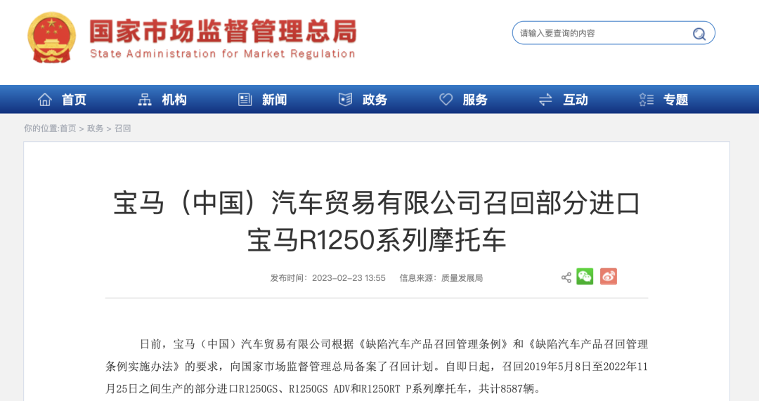 日前,寶馬(中國)汽車貿(mào)易有限公司根據(jù)《缺陷汽車產(chǎn)品召回管理條例》和《缺陷汽車產(chǎn)品召回管理條例實施辦法》的要求,向國家市場監(jiān)督管理總局備案了召回計劃。自即日起,召回2019年5月8日至2022年11月25日之間生產(chǎn)的部分進(jìn)口R1250GS、R1250GS ADV和R1250RT P系列摩托車,共計8587輛。