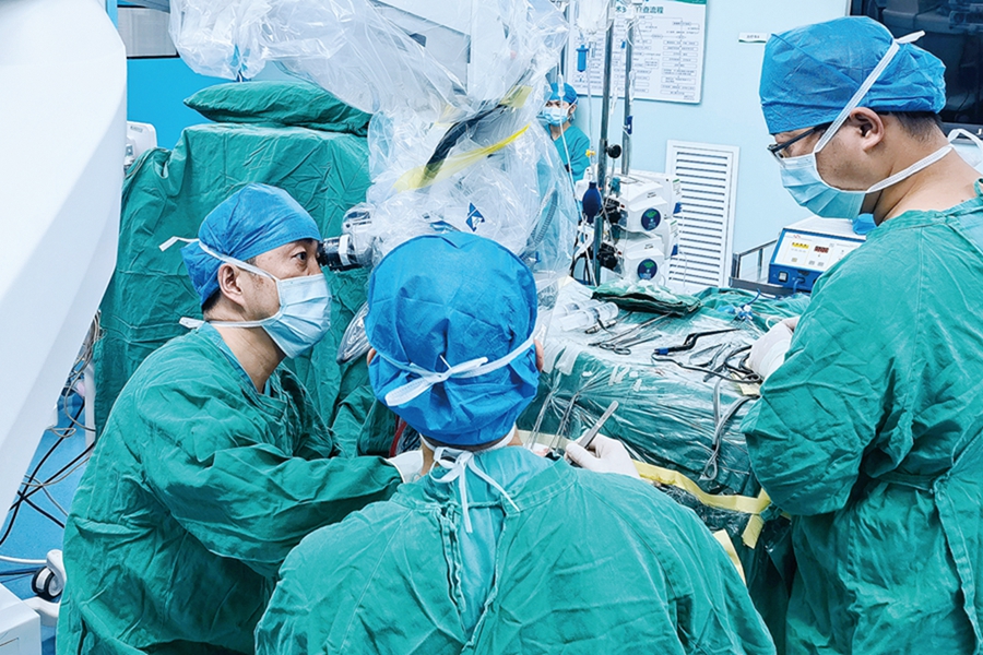 惠州市第三人民醫(yī)院院長、神經醫(yī)學中心主任李雪松博士(左一)在惠州市第六人民醫(yī)院開展高難度腦瘤切除手術。