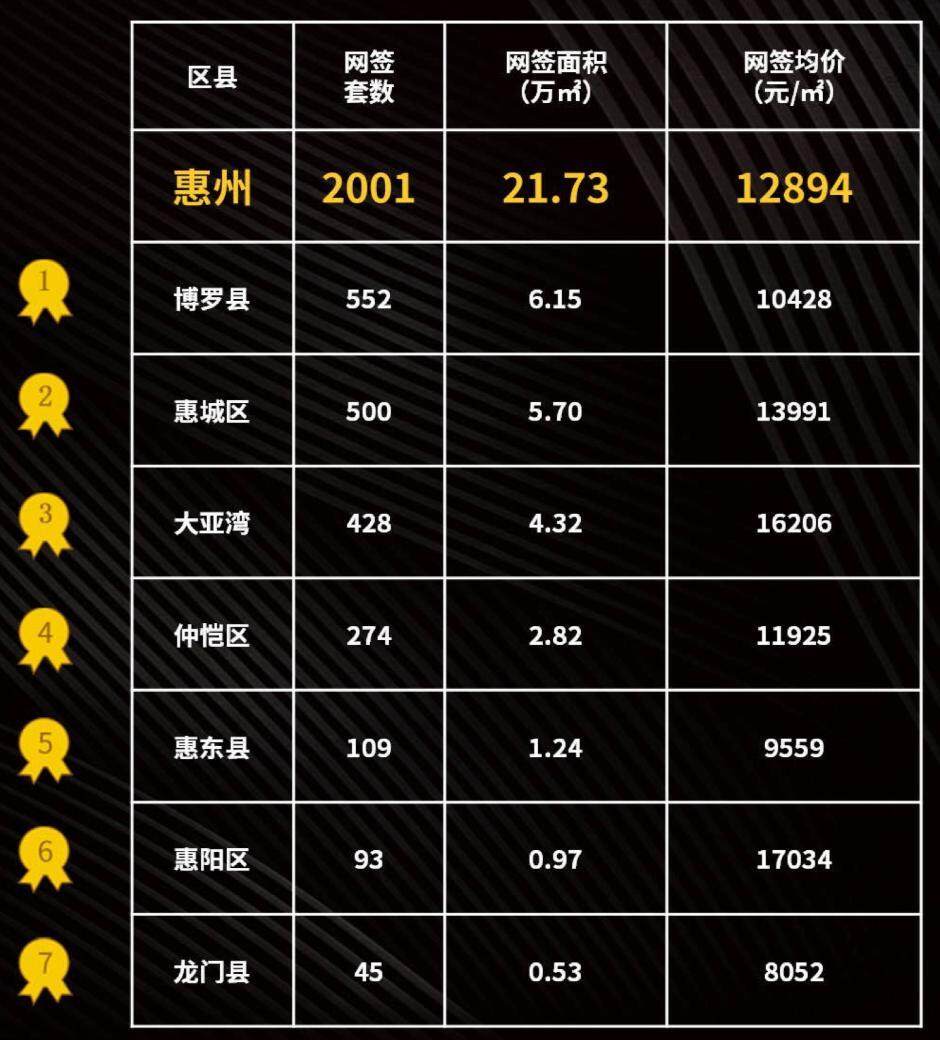 惠州市近12周商品房網(wǎng)簽走勢。從各區(qū)縣的一手住宅網(wǎng)簽數(shù)據(jù)來看,惠城區(qū)以2001套網(wǎng)簽居首位,仲愷區(qū)網(wǎng)簽居第二,其后分別為博羅縣、龍門縣、大亞灣、惠東縣、惠陽區(qū),各區(qū)縣除惠東縣網(wǎng)簽下降外,其它區(qū)縣網(wǎng)簽環(huán)比均上升。