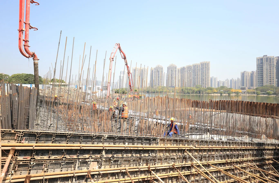 2月28日晚開(kāi)始承臺(tái)澆筑的是金山湖一號(hào)橋。記者3月1日上午在現(xiàn)場(chǎng)看到,混凝土天泵車伸出長(zhǎng)臂,將一車車混凝土澆筑到承臺(tái)內(nèi)。“我們正在進(jìn)行0號(hào)承臺(tái)的混凝土澆筑施工,橋梁共設(shè)置2個(gè)承臺(tái),承臺(tái)長(zhǎng)44.61米、寬36米、高4.5米,單個(gè)承臺(tái)混凝土方量為7300立方米。”金山湖一號(hào)橋項(xiàng)目副經(jīng)理鄧子敬介紹,金山湖一號(hào)橋橋梁全長(zhǎng)283米,為保證一次性跨越金山湖水道,橋梁設(shè)計(jì)凈跨達(dá)到196米,在相同結(jié)構(gòu)橋梁中,其跨度在全國(guó)位居前列。