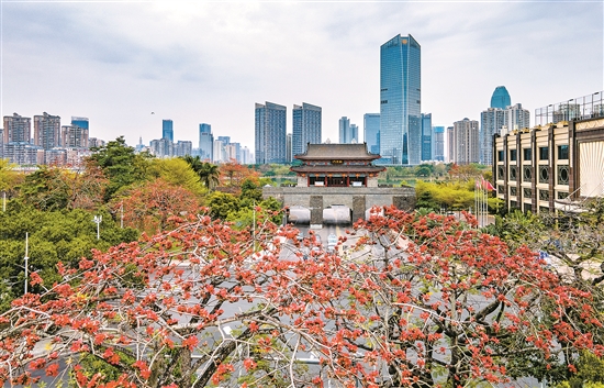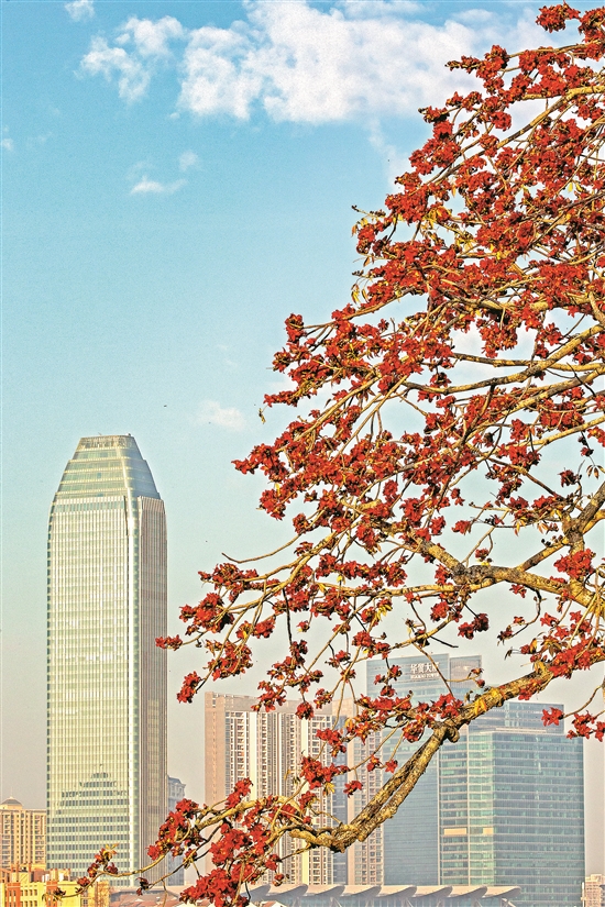 “最近聽說這邊的木棉開了,恰好出來活動活動。”住在附近的李奶奶說,趁著上午天氣好,就拉著老伴出來散步賞花,順便撿一些木棉花回去曬干煲湯。望著枝頭上的木棉花,在藍天白云的托襯下,似乎更加火紅,更加鮮艷。紅艷艷的木棉花為城市增添了濃濃的生機。