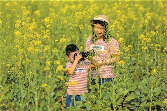 一片片金黃色的油菜花開滿了田間地頭,黃色的花朵點綴在綠葉間,微風拂過,搖曳生姿。金燦燦的油菜花還引來了無數(shù)小蜜蜂在花叢中“嗡嗡嗡”伴奏,好一派迷人的景象,令人賞心悅目,心曠神怡。趁著周末,不少的游客紛紛走出家門,在花叢中用鏡頭定格美好春光。