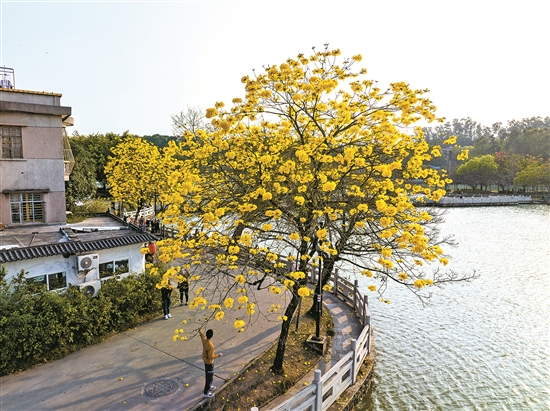 近日,在惠城菱湖旁,大片黃花風鈴木進入最佳觀賞期。一眼望去,這些黃花風鈴木就像披上了“黃金甲”,在陽光的照耀下,格外絢麗好看。微風輕撫,落英繽紛。數(shù)棵黃花風鈴木迎風招展,“見花不見葉”的特性讓它擁有別致的美麗,輕易俘獲眾人的青睞。引得市民游客三兩相約,穿梭在黃花風鈴木間,或閑聊或拍照,感受春日的美好。