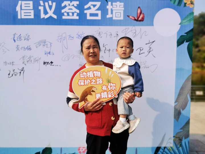 市民在保護(hù)野生動植物倡議墻上簽字合影。
