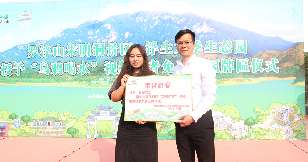 昨日下午,羅浮山朱明洞景區(qū)、浮生六季生態(tài)園聯(lián)合舉辦授予“烏鴉喝水”視頻作者免費(fèi)入園牌匾儀式,將“榮譽(yù)游客”稱號(hào)授予視頻作者彭令女士,讓其享受長期免費(fèi)入園待遇。
