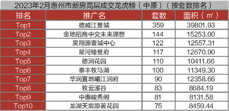 2月惠州新房高層成交龍虎榜。數(shù)據(jù)來源:惠州中原地產(chǎn)