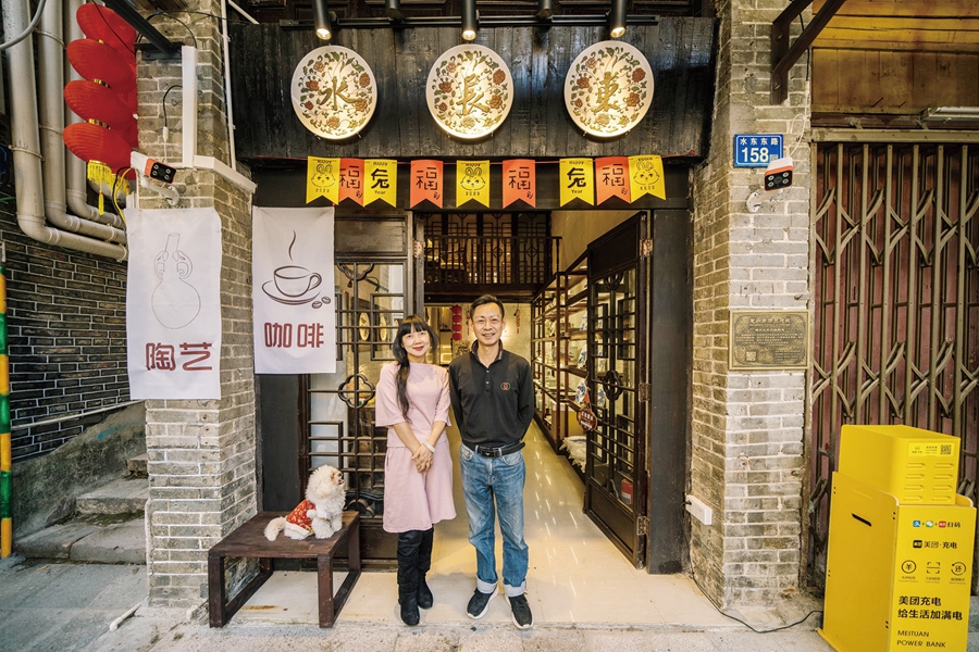 店主陳智揚和妻子王以旋在水長東咖啡瓷藝館門前。