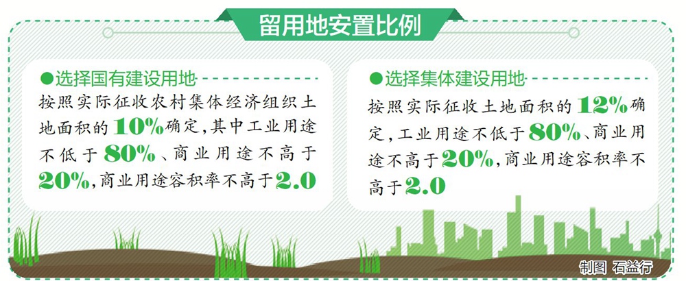 根據(jù)《管理辦法》,選擇國(guó)有建設(shè)用地作為留用地安置的,按照實(shí)際征收農(nóng)村集體經(jīng)濟(jì)組織土地面積的10%確定,其中工業(yè)用途不低于80%、商業(yè)用途不高于20%,商業(yè)用途容積率不高于2.0。