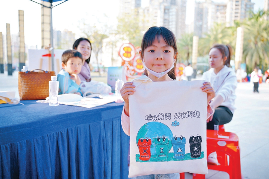 “媽媽,這里可以涂綠色嗎?”“這個格子應(yīng)該涂滿紅色,因?yàn)檫@個是有害垃圾桶。”在“綠色生活‘袋’回家”主題區(qū)域,一位小朋友在媽媽的指導(dǎo)陪伴下,手握彩筆,專心致志地在一個環(huán)保袋上涂鴉。