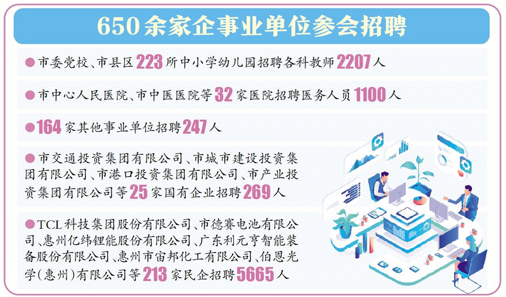 據(jù)了解,本次共有650余家企事業(yè)單位參會,具體包括市委黨校、市縣區(qū)223所中小學幼兒園招聘各科教師2207人;市中心人民醫(yī)院、市中醫(yī)醫(yī)院等32家醫(yī)院招聘醫(yī)務(wù)人員1100人;164家其他事業(yè)單位招聘247人;市交通投資集團有限公司、市城市建設(shè)投資集團有限公司、市港口投資集團有限公司、市產(chǎn)業(yè)投資集團有限公司等25家國有企業(yè)招聘269人;TCL科技集團股份有限公司、市德賽電池有限公司、惠州億緯鋰能股份有限公司、廣東利元亨智能裝備股份有限公司、惠州市宙邦化工有限公司、伯恩光學(惠州)有限公司等213家民企招聘5665人。