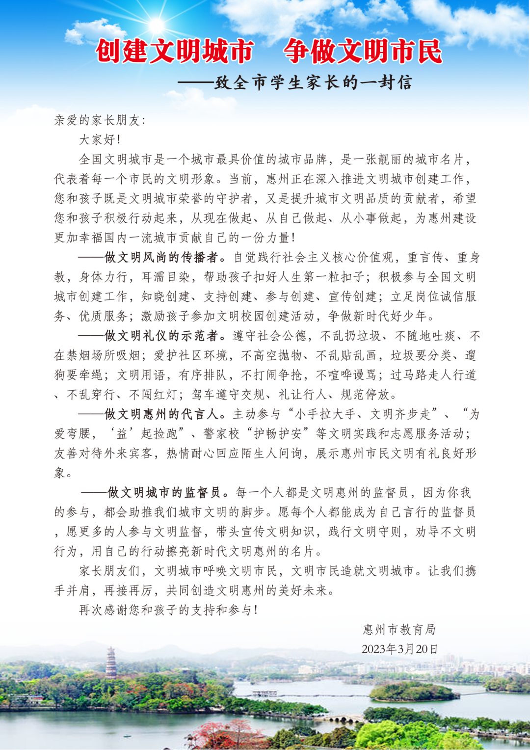 創(chuàng)建文明城市,爭做文明市民——致全市學(xué)生家長的一封信