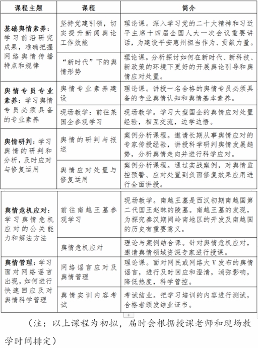 記者了解到,此次特訓班將在中山大學新港西路本部南校區(qū)開班,時間為4月10日至14日共5天,培訓費用為4880元/人(不含交通),課程涵蓋“新時代下的輿情形勢”“輿情專業(yè)素養(yǎng)建設”等專業(yè)理論內容,以及到大型企業(yè)現(xiàn)場參觀教學等。