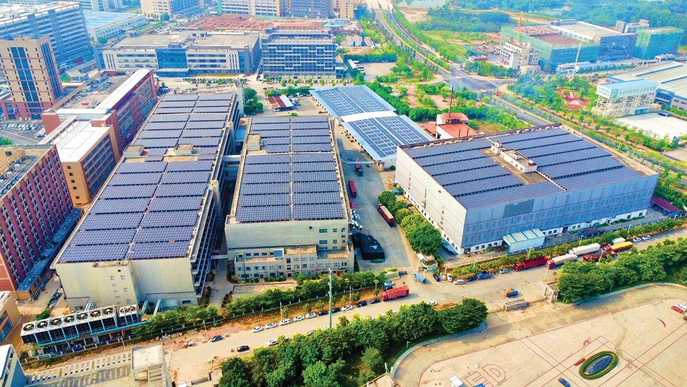 廣東雪榕生物科技有限公司的廠房屋頂上,太陽能光伏板整齊排列。