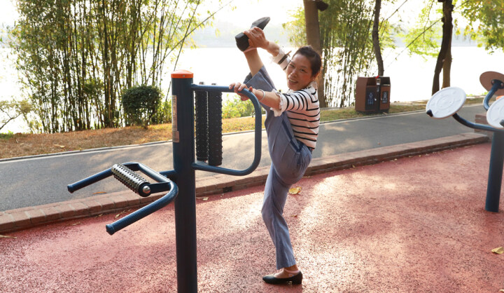 手和腳搭在背部按摩器的扶手上,游刃有余地做出“一字馬”動作,然后在單杠上拉伸身體……到市區(qū)東江公園進(jìn)行柔韌性身體鍛煉,是市民王元娥每天必不可少的“打卡項目”。
