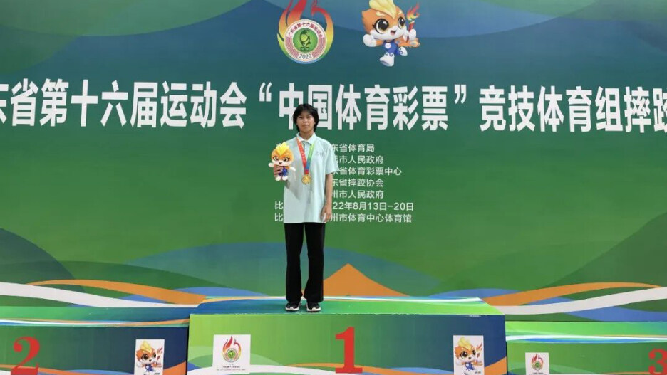 劉美希榮獲廣東省第十六屆運(yùn)動會摔跤(自由式)女子乙組46KG第一名。