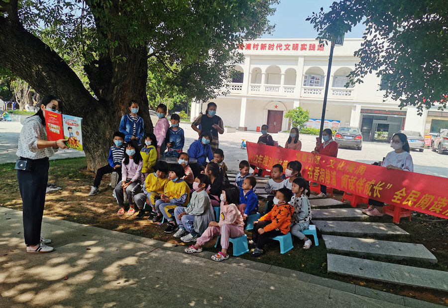 孩子們?cè)谛聲r(shí)代文明實(shí)踐站前的樟樹(shù)下朗讀。