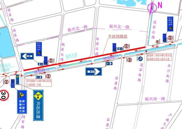 目前,一期改造工程已進(jìn)入關(guān)鍵施工階段,為確保振興大道一期改造工程能順利按期完成,根據(jù)施工計(jì)劃要求,屆時(shí)將對(duì)振興大道將軍路路口至逕茹南路口段封閉北側(cè)半幅進(jìn)行施工,保留南側(cè)半幅單向行駛,即由東向西行駛車輛從逕茹南路路口至將軍路路口現(xiàn)狀道路南側(cè)兩車道單向行駛,由西向東行駛車輛從將軍路路口南側(cè)轉(zhuǎn)入規(guī)劃路三行駛,然后從逕茹南路路口進(jìn)入振興大道(詳見(jiàn)附圖)。