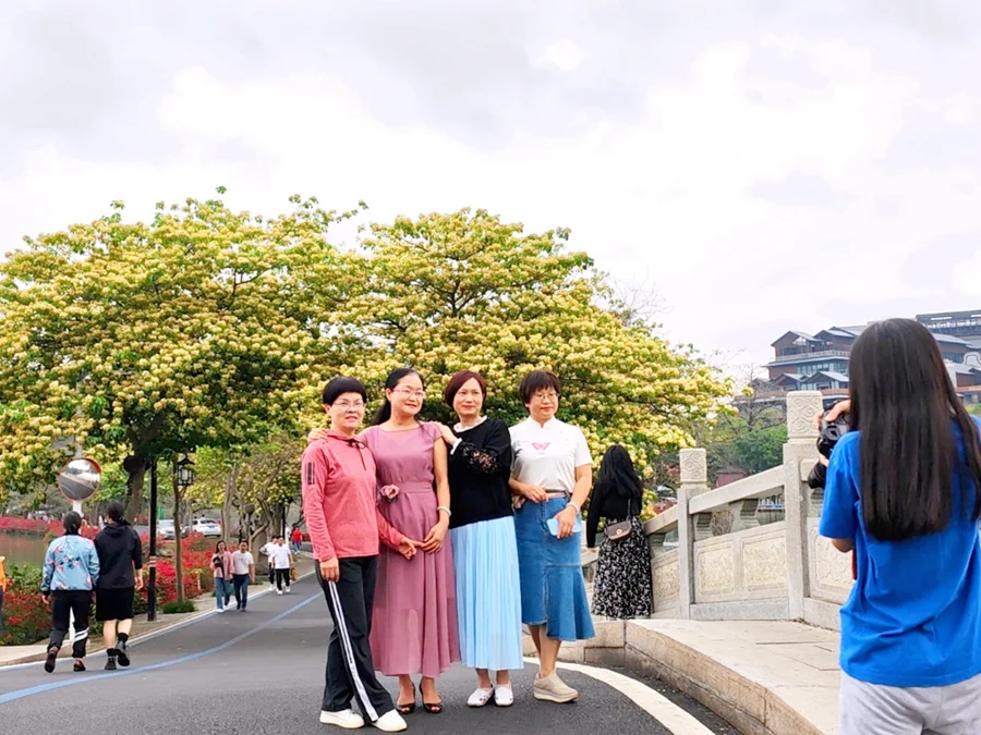 清明時(shí)節(jié),人們紛紛來到陳公堤踏青賞花。漫步堤岸,層層疊疊的魚木花壓滿枝頭,遠(yuǎn)遠(yuǎn)望去,宛如云蒸霞蔚,為過往的市民游客送去幸福、吉祥、如意。清風(fēng)拂過,攜來陣陣淡雅清香,花瓣緩緩飄落,優(yōu)雅浪漫。細(xì)賞魚木花,雪白和金黃的花瓣輕盈舒展似蝴蝶展翅,紫紅色的細(xì)長花蕊像蝴蝶觸角,整一個(gè)仙氣飄飄。