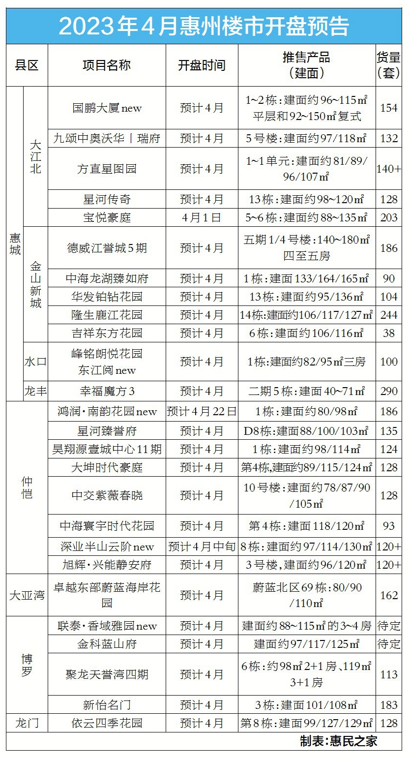 一般而言,市場熱度能否持續(xù),也受供應(yīng)量的影響。從供應(yīng)方面來看,惠州4月或迎來供應(yīng)“小高峰”,為惠州樓市預(yù)留了上行空間。據(jù)惠民之家數(shù)據(jù)監(jiān)控中心不完全統(tǒng)計(jì)(截至3月31日),2023年4月惠州全市預(yù)計(jì)26個(gè)樓盤推新,超4000套新房入市。同為惠民之家統(tǒng)計(jì)數(shù)據(jù),3月惠州全市“計(jì)劃推新”項(xiàng)目僅18個(gè)。