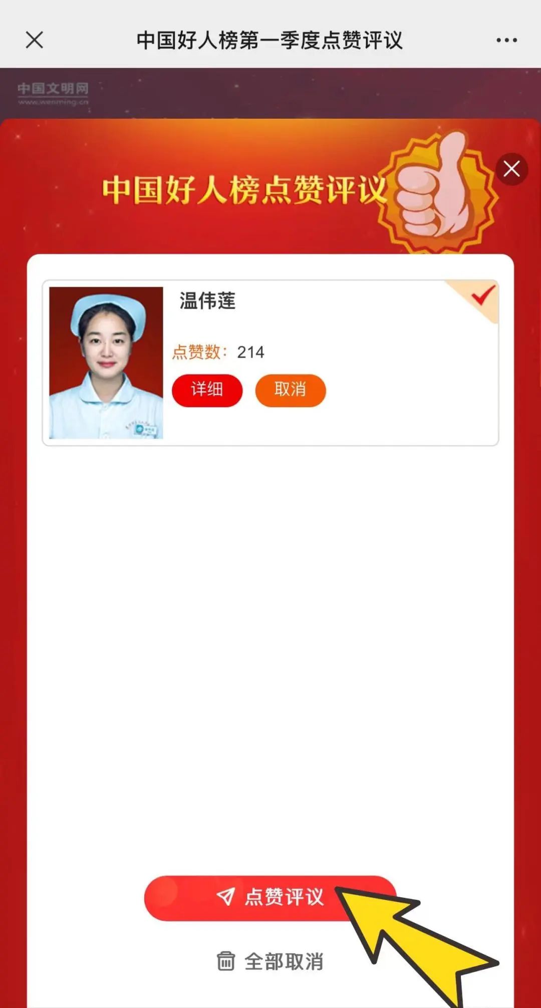 惠城區(qū)共有1名候選人參與此次點(diǎn)贊評議活動,快動動手指為我區(qū)溫偉蓮點(diǎn)贊吧!