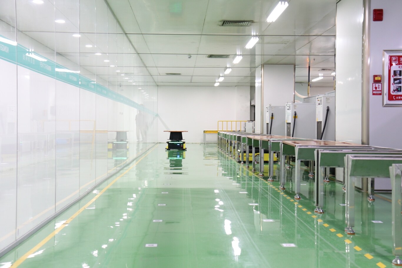 惠州市金百澤電路科技公司智能制造車間,AGV上貨小機(jī)器人上貨。