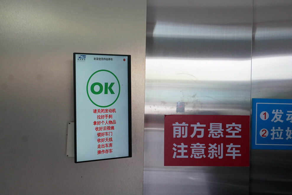 4月12日上午9時許,記者駕車來到花邊嶺智慧停車場體驗,將車頭對準車庫門后,不久車庫門便徐徐開啟,然后將車輛開進預定軌道即可,車庫內正前方還設置了一面落地鏡,以方便車主對照順利進入軌道內,按照指引操作,一般不會發(fā)生剮蹭等現(xiàn)象。車輛停好后,車頭左側顯示屏會自動提醒車主關閉發(fā)動機、拉好手剎、收好后視鏡等。