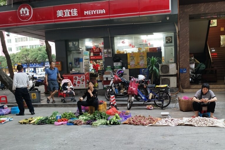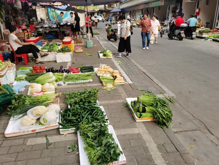 隨后,記者在惠城區(qū)河南岸街道斑樟湖一橫街看到,幾名商販把蔬菜水果等擺在機(jī)動(dòng)車道上。當(dāng)時(shí)正值上下班高峰,陸續(xù)有汽車、電動(dòng)車避讓通過。