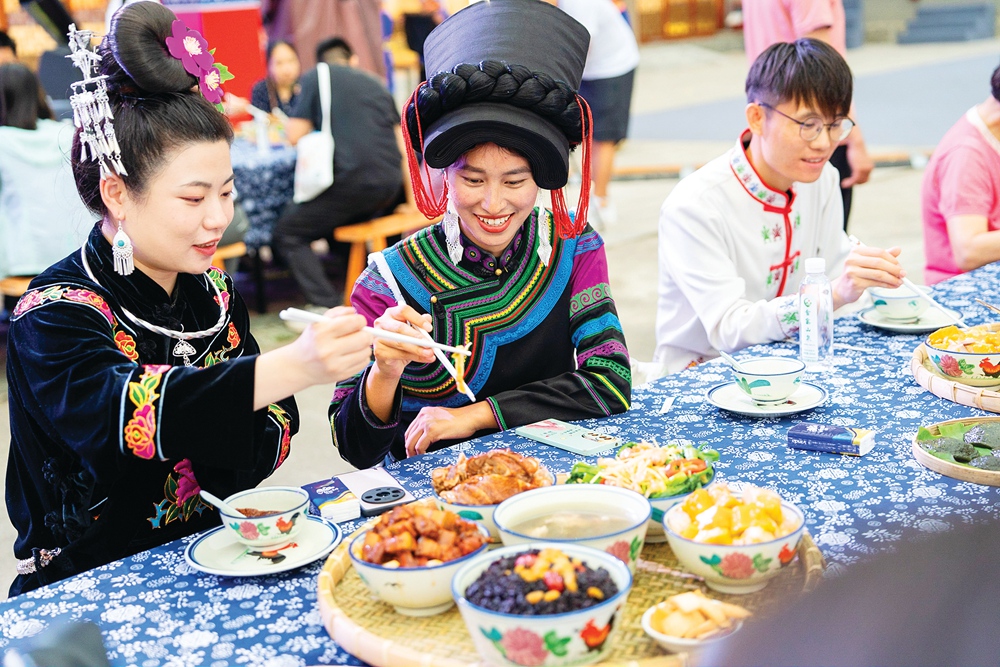 “‘三月三’長桌宴開飯啦!”為了迎接遠道而來的貴客,此次活動不僅帶來了富有畬族特色的民族歌舞,還準備了畬族特色長桌宴。一碗碗畬族傳統(tǒng)菜肴擺滿長桌,冒著騰騰熱氣。長桌一旁,象征火紅生活的篝火熊熊燃燒。飯后,畬族同胞與賓朋心手相連,隨著音樂的旋律歡快地舞動起來。當天,畬族同胞還帶領(lǐng)游客們齊跳竹竿舞,現(xiàn)場竿聲陣陣、笑聲飄揚。“我們感受到了濃濃的民族風情!”游客鄭先生特意與朋友前來體驗畬族風情,他第一次參加畬族文化活動便深刻感受到了畬族文化的魅力。