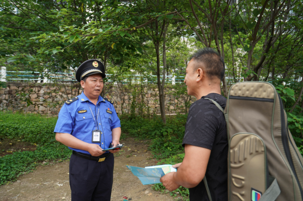 執(zhí)法人員向垂釣人員派發(fā)宣傳手冊引導(dǎo)文明垂釣。惠州日報記者湯渝杭 攝