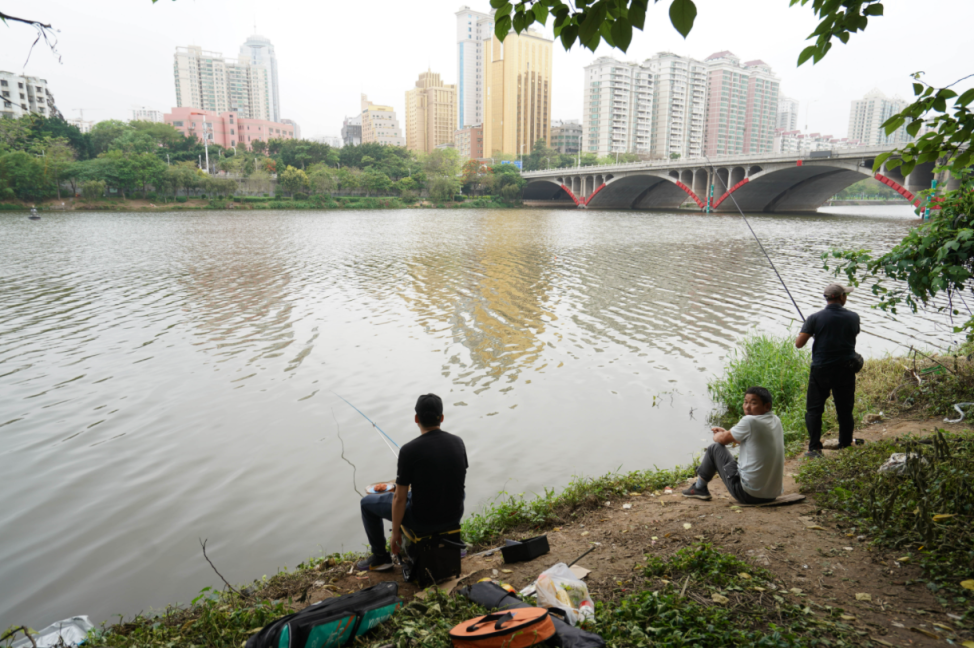 不少垂釣人員已經(jīng)擺開裝備,支起魚竿,坐在江邊釣魚。