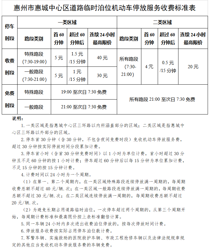 惠州市惠城中心區(qū)道路臨時(shí)泊位機(jī)動(dòng)車(chē)停放服務(wù)收費(fèi)執(zhí)行新標(biāo)準(zhǔn)