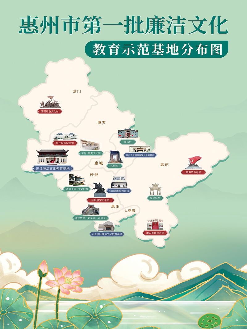 惠州有一張廉潔文化教育“地圖”,東江廉潔文化教育基地、市反腐倡廉警示教育基地、葉挺將軍紀(jì)念園、高潭革命老區(qū)、墨園村、東江縱隊(duì)紀(jì)念館、低冚紅色村……