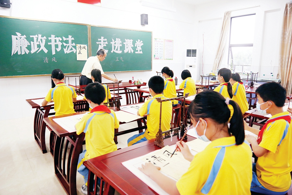 廉政書法進(jìn)課堂活動(dòng),圖為書法老師在指導(dǎo)學(xué)生寫毛筆字。