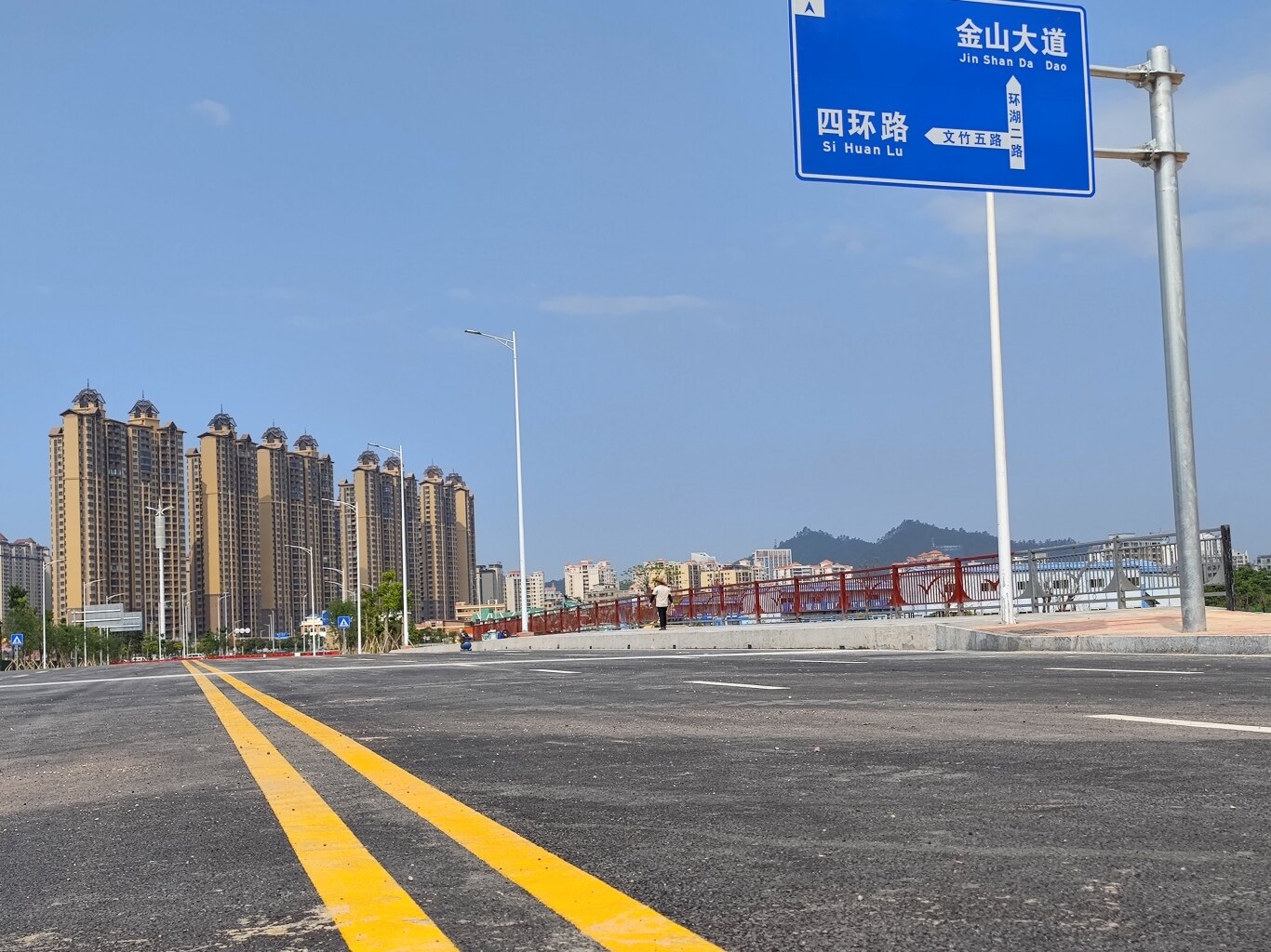 環(huán)湖二路南段起點接金山大道金山二橋南橋頭,終點與文竹三路相交,28日上午9時許,記者來到環(huán)湖二路南段時看到,該路段鋪設(shè)了整潔平坦的瀝青混凝土路面,交通指示牌等設(shè)置清晰,道路兩邊綠化植物生機勃勃。
