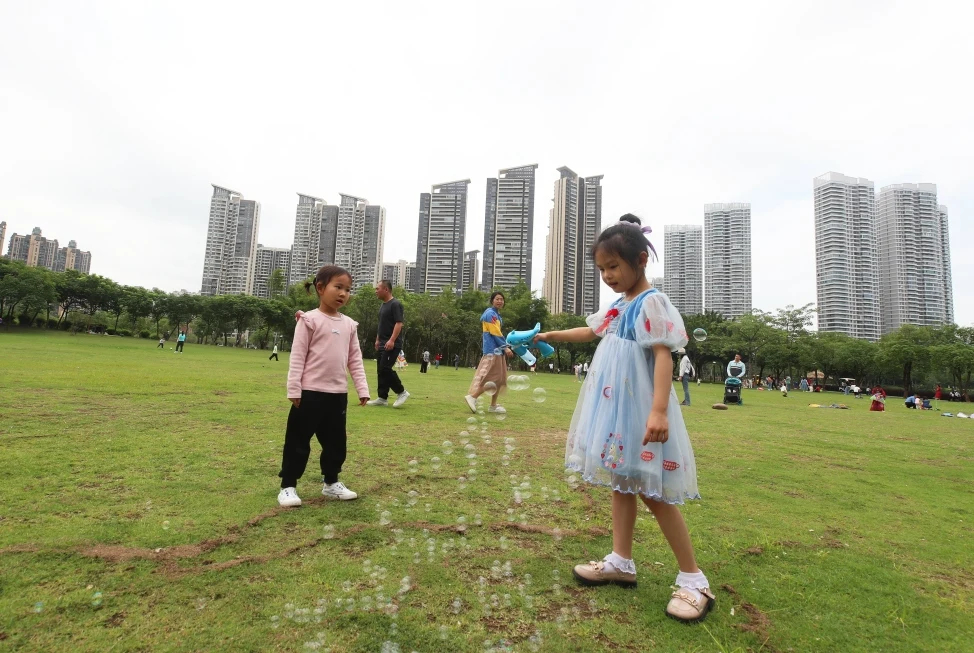 小朋友在市區(qū)金山湖公園玩耍。