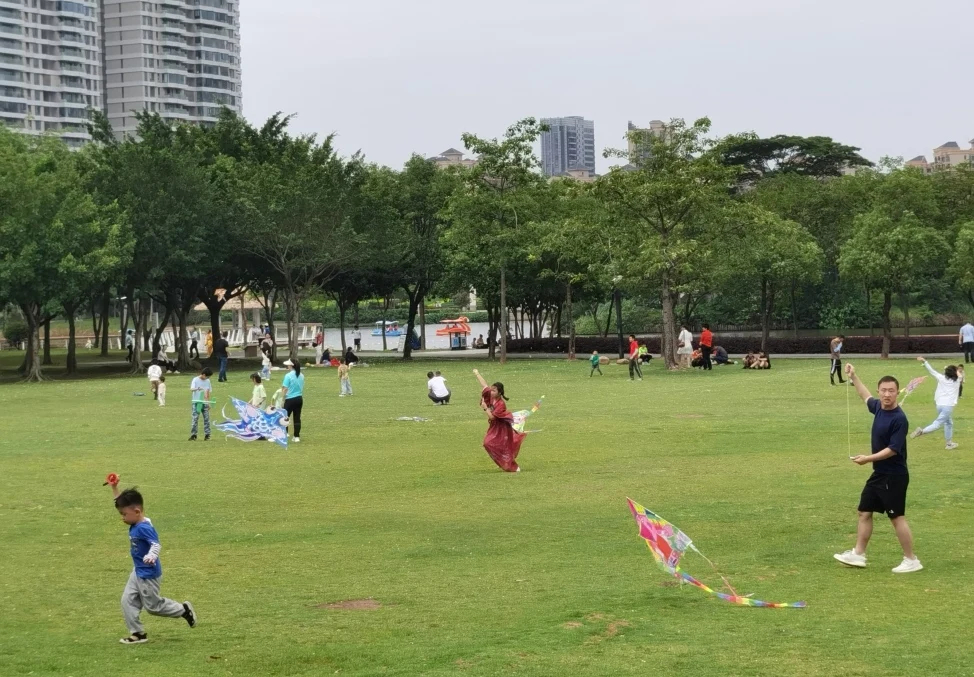 市民在市區(qū)金山湖公園放風箏,享受五一假期。