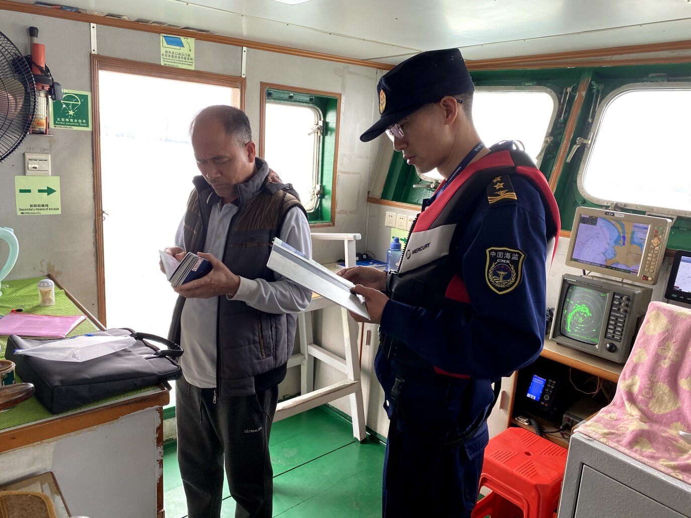 海洋綜合執(zhí)法人員檢查漁船設(shè)備,做好休漁安全監(jiān)管工作。