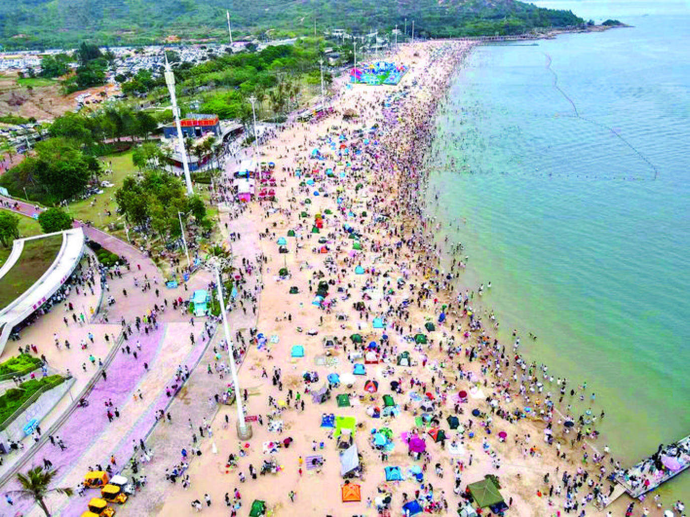 4月30日14時30分,大亞灣黃金海岸沙灘人流飽和,當日預(yù)約關(guān)閉。惠州日報記者黃旭新 攝