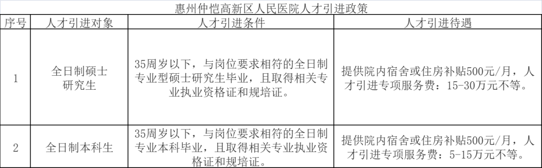 (2)醫(yī)師類崗位凡符合《惠州仲愷高新區(qū)人民醫(yī)院人才引進方案》的,同時享受人才引進相關待遇。詳見下表: