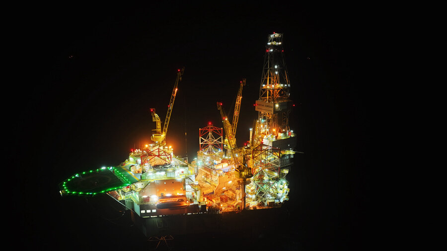 夜間航拍鏡頭下,“國(guó)瑞”平臺(tái)燈火通明,海洋石油工人輪班交替忙碌著為祖國(guó)“尋油”。
